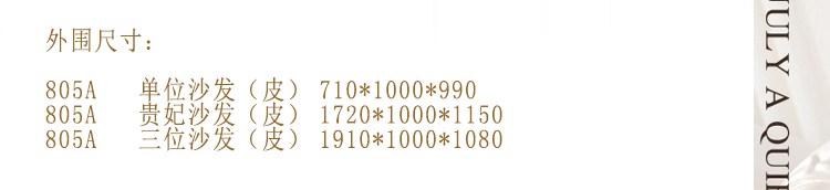 外围尺寸:805A单位沙发(皮)710*1000*990; 805A贵妃沙发(皮)1720*1000*1150; 805A三位沙发(皮)1910*1000*1080。