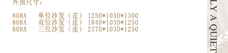 外围尺寸:808A单位沙发(皮)1250*1030*1300; 808A双位沙发(皮)1840*1030*1250; 808A三位沙发(皮)2370*1030*1250。