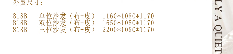 外围尺寸:818B单位沙发(布+皮)1160*1080*1170; 818B双位沙发(布+皮)1650*1080*1170; 818B三位沙发(布+皮)2200*1080*1170。