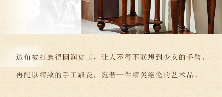 采用美国认证高标准原木为主材;经济实惠又环保。国内知名设计师独家设计;中西方文化合并的极致之做;具有中式的节约;同时也不失西式的华贵优雅;十分庄重。一流的工艺水准,坚实稳固,经典隽永;线条流畅,曲致玲珑;衬托家中风格韵味!
