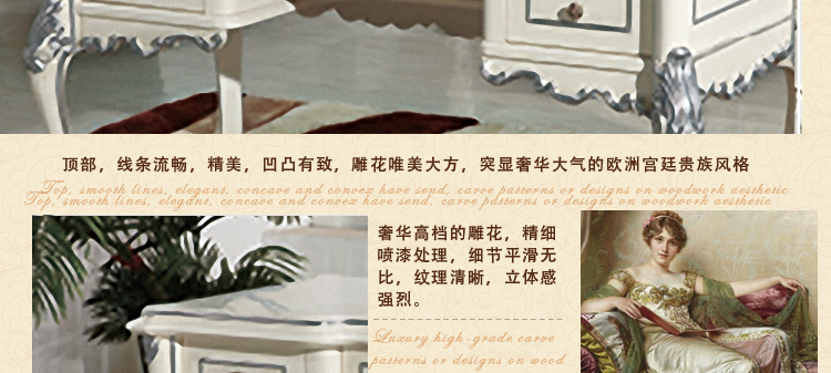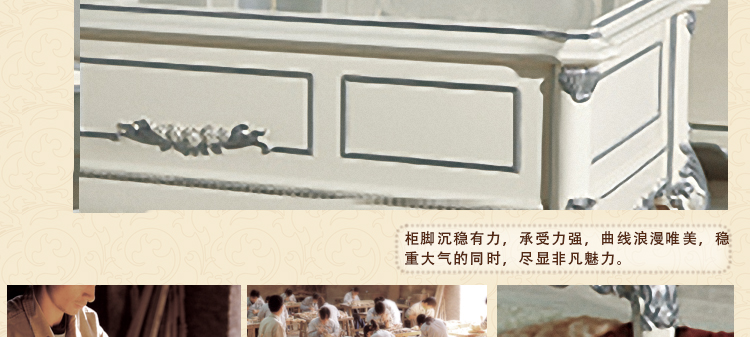 厂家直销--品质保证--售后无忧:1、实木抽屉,更绿色。2、E1环保密度板材柜体。3、每块板材四周封边处理。4、优质五金配件。5、内置更多层储物空间和通风透气孔。6、象牙白烤漆,品质细节更完美到位。