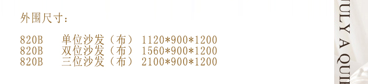 外围尺寸:820B单位沙发(布)1120*900*1200; 820B双位沙发(布)1560*900*1200; 820B三位沙发(布)2100*900*1200。