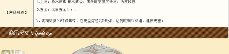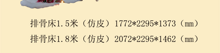 外围尺寸: T07排骨床1.5米(仿皮)1772*2295*1373; T07排骨床1.8米(仿皮)2072*2295*1462; T07床头柜594*450*600