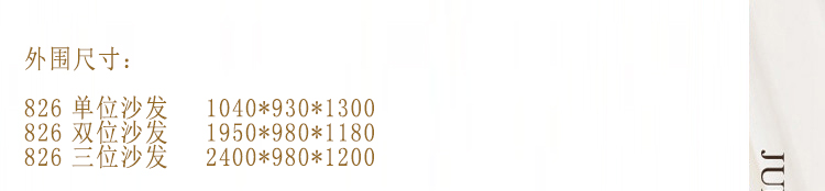 外围尺寸:826单位沙发1040*930*1300; 826双位沙发1950*980*1180; 826三位沙发2400*980*1200。