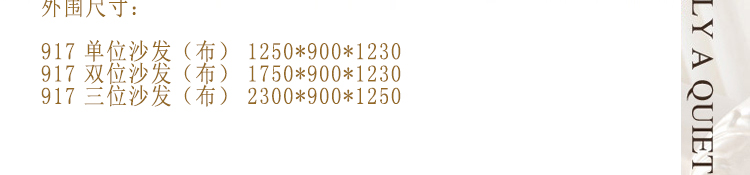 外围尺寸:917单位沙发(布)1250*900*1230; 917双位沙发(布)1750*900*1230; 917三位沙发(布)2300*900*1250。