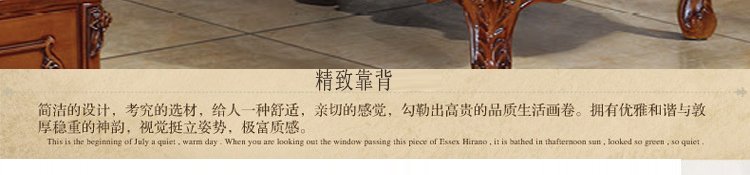 采用美国认证高标准原木为主材;经济实惠又环保。国内知名设计师独家设计;中西方文化合并的极致之做;具有中式的节约;同时也不失西式的华贵优雅;十分庄重。一流的工艺水准,坚实稳固,经典隽永;线条流畅,曲致玲珑;衬托家中风格韵味!