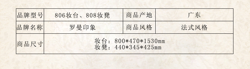 外围尺寸:806妆台:800*470*1530mm; 808妆凳:440*345*425mm