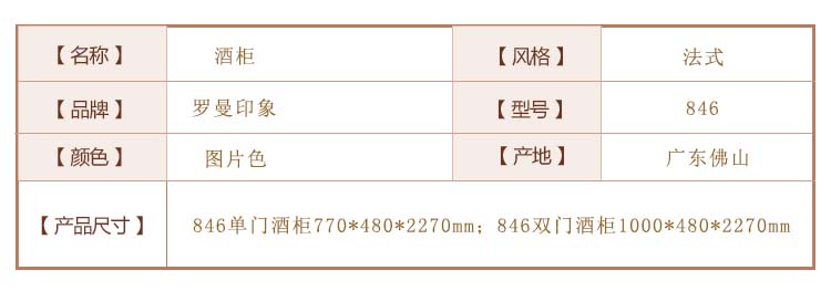 外围尺寸:846单门酒柜770*480*2270mm; 846双门酒柜1000*480*2270mm。