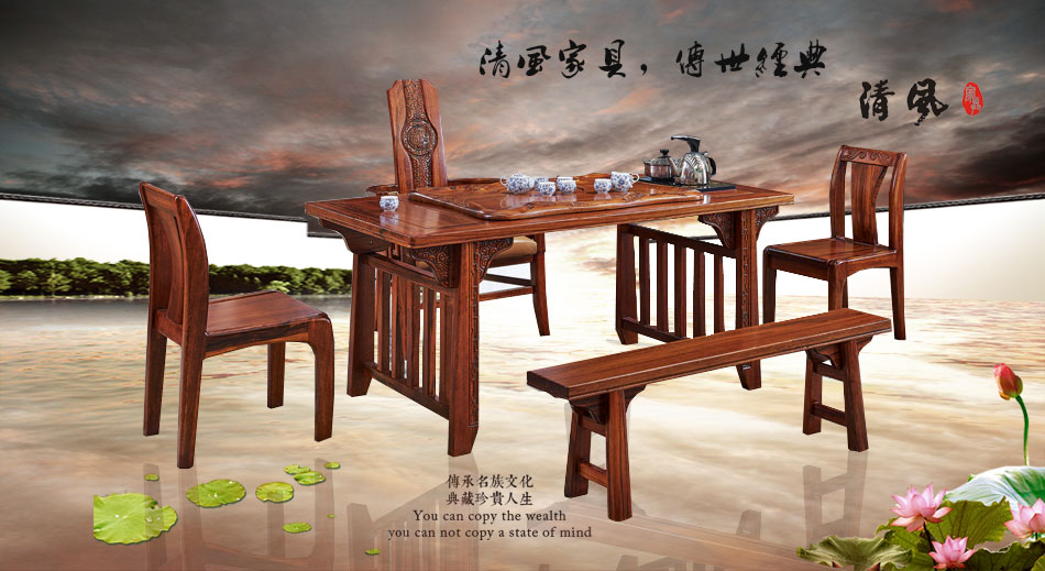 立即购买清风 茶桌椅组合 仿古中式胡桃木茶台全实木茶台茶桌茶凳餐桌6098茶台6099茶凳6095长茶凳