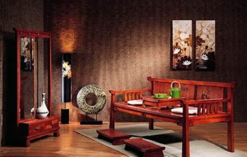 例如这对玄关椅,作为江南人家客厅第二排、小姐家属会客时正坐的椅子。座面短、靠背直、无扶手,随时保持着正坐姿势,拘谨中却透出优雅和涵养。设计师在整块木板的低椅背上雕出圆洞,镶嵌一块有着素白底色、有着墨绿石纹的圆石。水墨般的石纹让椅子更有文化韵味,小家碧玉的闺房椅也变得大气坚毅。